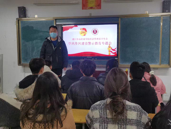 为深入学习全国学联二十七大、习近平总书记贺信和党中央致词精神,深入推进学生会组织改革,改进学生会工作人员学风作风、打造清新形象,践行“为同学服务”的宗旨,经济管理系于2020年12月18日下午在D106教室组织开展了学生会学风作风建设警示教育专题会。会议由经济管理系学生会执行主席杨馨宇主持,团总支负责人刘泽宁主讲,学生会全体工作人员及各班班委参加了会议。