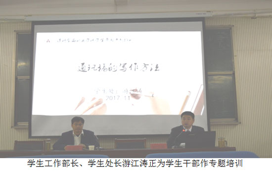 游江涛老师首先引导大家如何关注和挖掘校园生活中的焦点和热点,然后他从消息和通讯的基本理论入手,讲解新闻稿的基本格式与基础常识,为大家展示了优秀新闻稿件,讲解了基本格式在每篇范文中的应用与变形,告诉大家要学会举一反三,又结合工作实际为大家分析了学生干部缩写的新闻原稿中出现的问题。最后游江涛老师生动而详细地讲解了大家在培训前提出的如何避免流水账、如何把握详略等问题。
