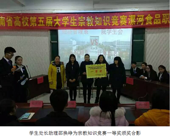 为提高学生正确认识和对待宗教问题的能力,我院学生会在学院学工部的指导下举办第五届大学生宗教知识竞赛,比赛分为初赛和决赛两个环节,初赛采用网络竞赛形式,决赛采用现场比赛形式。决赛现场,初赛阶段胜出的四个代表队经过精心准备,沉着作答,灵活应变,以过硬的知识储 备和紧密的团队合作,博得了现场阵阵掌声。赛场气氛热烈。经过激烈的角逐,经济管理系代表队获得大赛一等奖,食品检测系代表队荣获二等奖、学生会代表队荣获三等奖、信息工程系代表队荣获优秀组织奖。