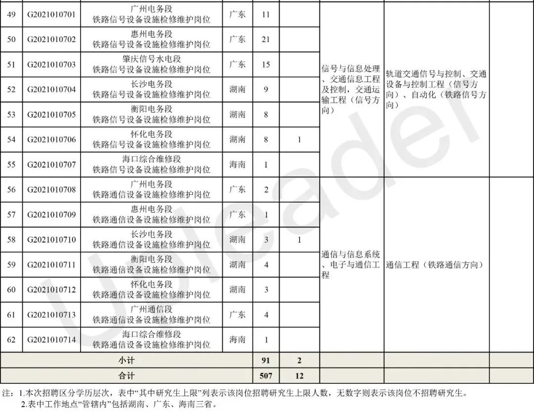 招聘计划:507人;列入国家招生计划、具备派遣资格的应届普通高等院校铁路主专业研究生和全日制本科毕业生。