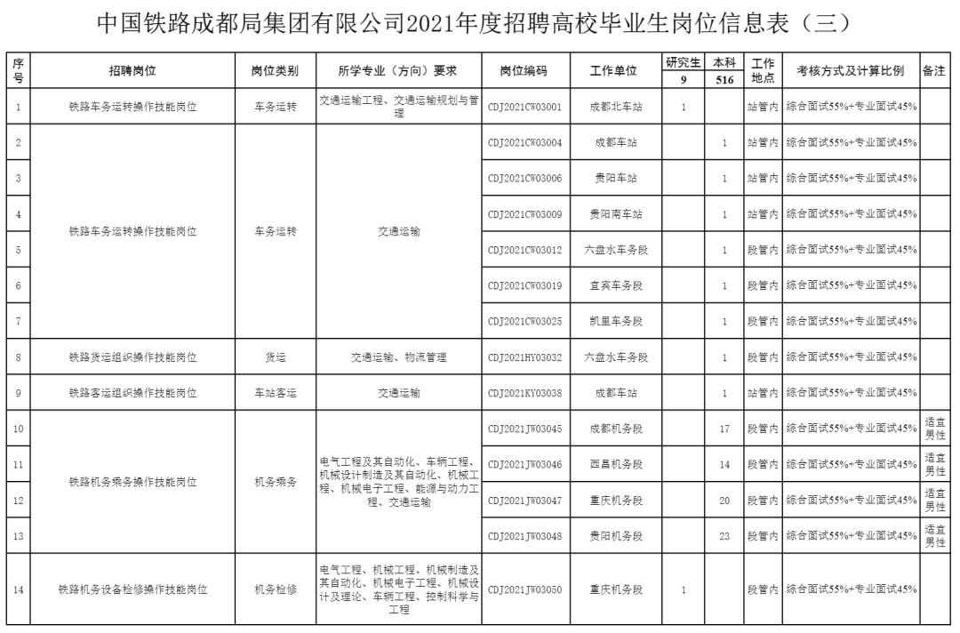 中国铁路成都局集团有限公司2021年度招聘高校毕业生公告(三)