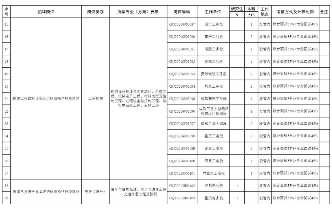 招聘岗位采取“笔试+面试”考核方式。笔试主要对应聘人员进行铁路基本知识和基本原理、公共基础知识、语文表达、数学基础、逻辑推理、英语应用能力、体质健康以及专业知识等内容的测试。