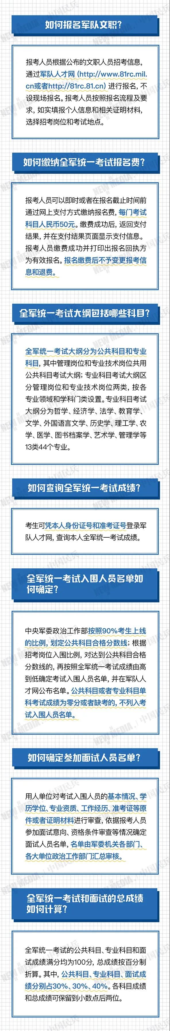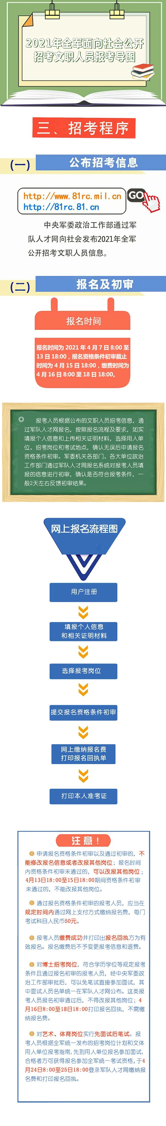 根据计划安排,报考人员可以于4月7日至13日通过军队人才网报名,5月23日全军组织统一考试,11月底前完成面试体检、政审考察、公示审批和补充录用等工作。这次公开招考,适应军队改革和部队建设需要,适度扩大招考数量,加大对军队烈士亲属的优待力度,对文体岗位实行先面试后笔试,通过完善制度机制,优化程序办法,强化监督服务,落实疫情常态化防控要求,进一步提高人才引进质量效益,确保招考工作安全规范、公平公正、顺利圆满。