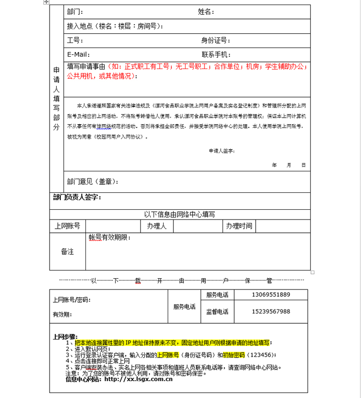 漯河食品职业学院(南校区)有线办公上网帐号申请表