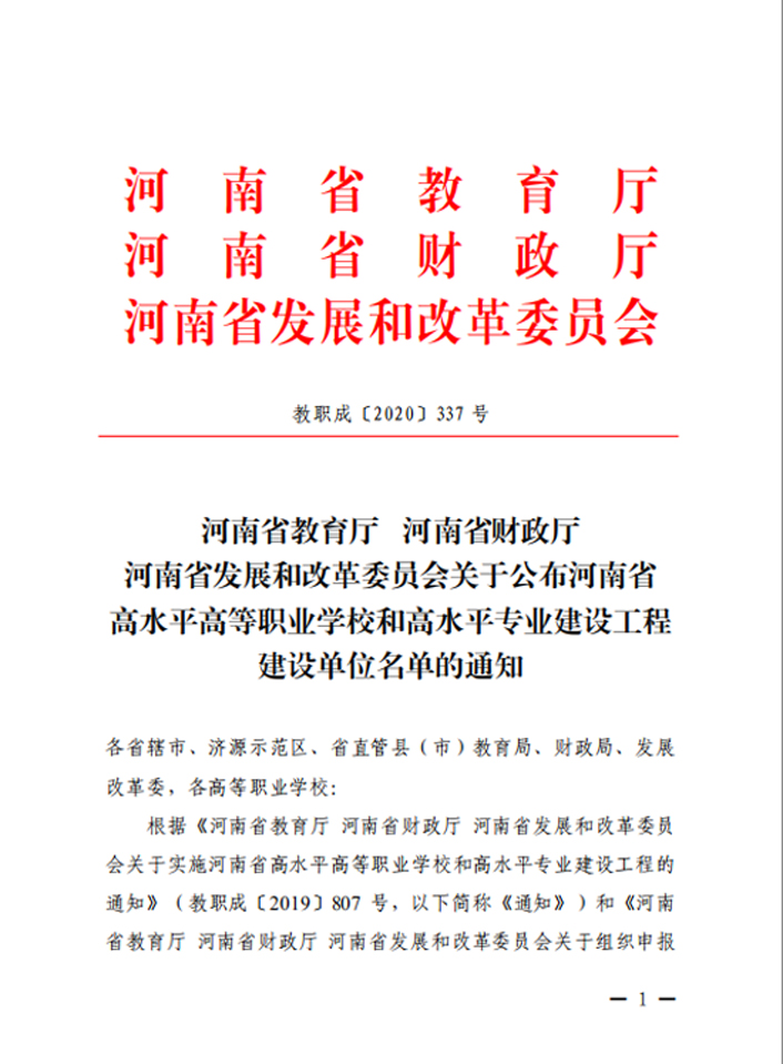 8月24日,河南省教育厅、河南省财政厅、河南省发展和改革委员会下发《关于公布河南省高水平高等职业学校和高水平专业建设工程建设单位名单的通知》(教职成〔2020〕337号),我院获河南省高水平高等职业学校建设单位,我院食品加工技术专业获河南省高水平专业建设立项。