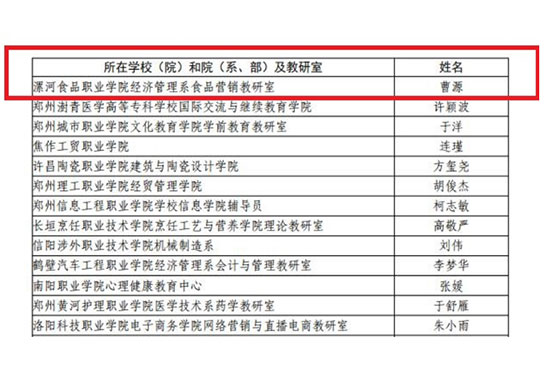 近日,中共河南省委教育工委河南省教育厅下发《关于公布2023年度全省教育系统“两创两争”活动先进集体和先进个人评选结果的通知》(豫教工委〔2023〕112号),经过申报评选推荐,组织资格审查,专家集中评审,网上公示等环节,表彰先进集体和先进个人,我院获评多项荣誉称号。其中,我系食品营销教研室曹源同志获评“...... 阅读(2122)