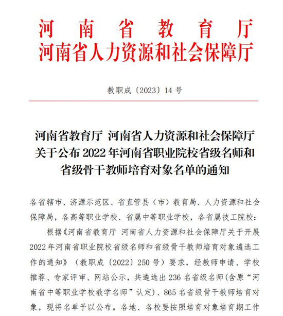 近日,河南省教育厅、河南省人力资源和社会保障厅下发了《河南省教育厅、河南省人力资源和社会保障厅关于公布2022年河南省职业院校省级名师和省级骨干教师培育对象名单的通知》(教职成[2023]14号),我系张晓丽、曹源、韩秀枝三名副教授入选2022年河南省职业院校省级名师培育对象,李雁函入选2022年河南省职...... 阅读(1614)