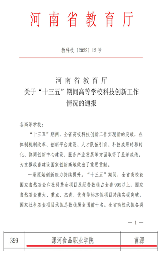 近日,河南省教育厅发布《河南省教育厅关于“十三五”期间高等学校科技创新工作情况的通报》(教科技〔2022〕12号),肯定了全省高校“十三五”期间,在体制机制改革、创新平台建设、人才队伍引育、科技成果转移转化、协同创新中心建设、服务产业发展等方面所取得的显著成绩,我系主任曹源同志被评为“河南省高校科研管理工...... 阅读(1653)