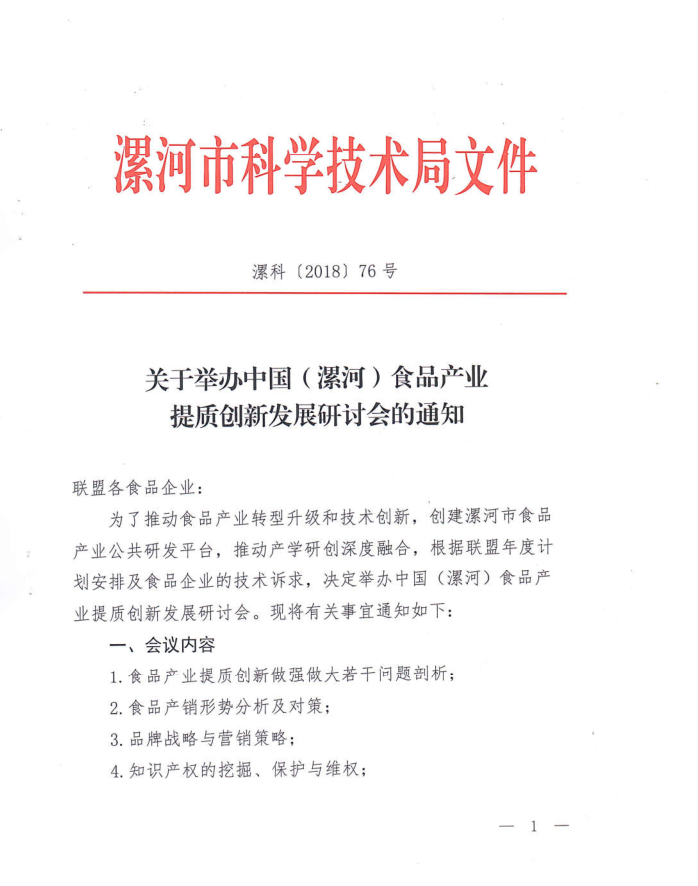关于举办中国(漯河)食品产业提质创新发展研讨会的通知