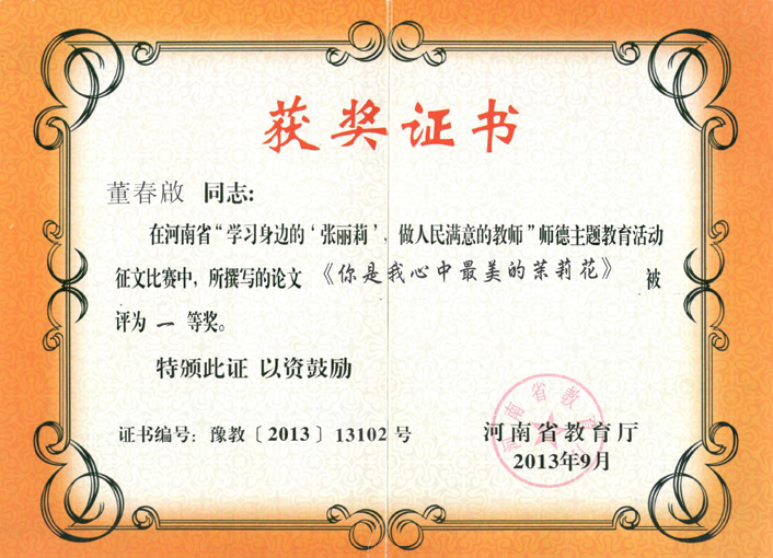 河南省教育活动中《你是我心中最美的茉莉花》荣获一等奖2013-董春启