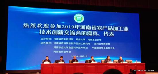 12月21日,由河南省农业农村厅、郑州大学、河南工业大学主办,河南省农科院农副产品加工研究所、郑州大学农学院、河南农业大学食品科学技术学院、中国粮油学会食品分会、河南省食品学会承办的2019年河南省农产品加工业技术创新交流会议在黄河迎宾馆顺利召开。河南省农业农村厅副厅长刘保仓、河南省农业农村厅党组成员、总农艺师王俊忠、国家“万人计划”科技创新领军人才、中国农业科学院农产品加工研究所副所长张德权等300余家单位、500余人参加会议。我院科技处处长、食品科学副教授周婧琦参加此次会议。