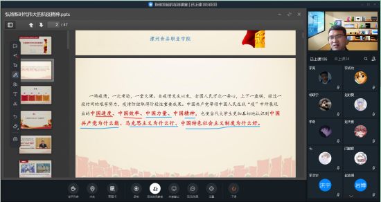 4月22日下午,我校党委副书记程东阳教授为质检一二班上了一堂令人精神振奋的抗疫思政线上课。程书记以《弘扬新时代伟大的抗疫精神》为题,分析我国抗疫面临的国内外形势,深入讲解了党中央对疫情防控的决策部署、疫情防控“以人民为中心”的思想,以及伟大的抗疫精神的内涵,即生命至上、举国同心、舍生忘死、尊重科学、命运与共。程书记叮嘱...... 阅读(1387)