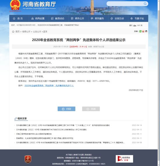 2020年2月18日,河南省教育厅办公室下发《关于公布2019年度河南省民办教育先进集体和先进个人》的通知,我部教师王含被评为2019年度河南省民办教育先进个人。附件:河南省教育厅办公室关于公布2019年度河南省民办教育先进集体和个人的通知各省辖市、济源示范区教育局,省直管县(市)教育局,各民办普通高等学校: ...... 阅读(1421)