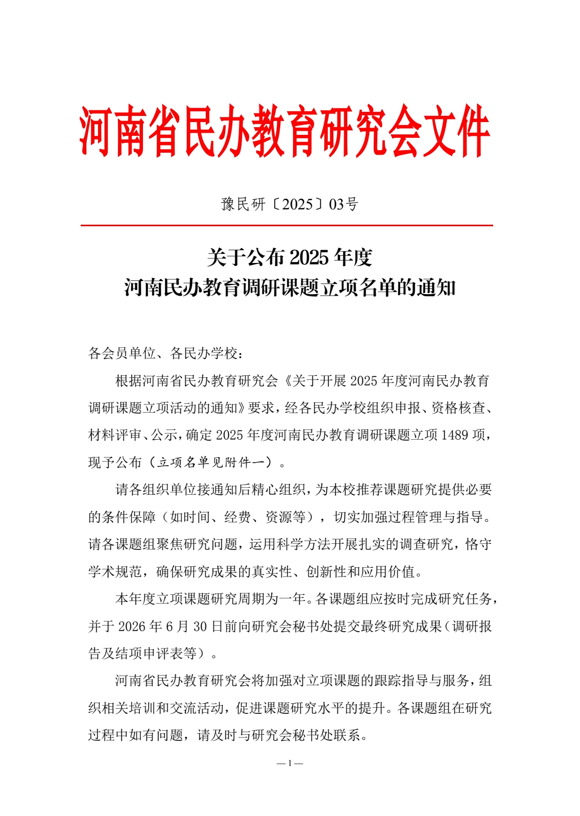 2025/07/04我院1项2025年度河南民办教育调研课题获批立项
