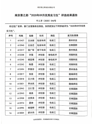 2020/10/09南京喜之郎“2020年9月优秀实习生”评选结果通告