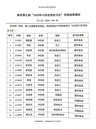 2020/11/30南京喜之郎“2020年10月优秀实习生”评选结果通告