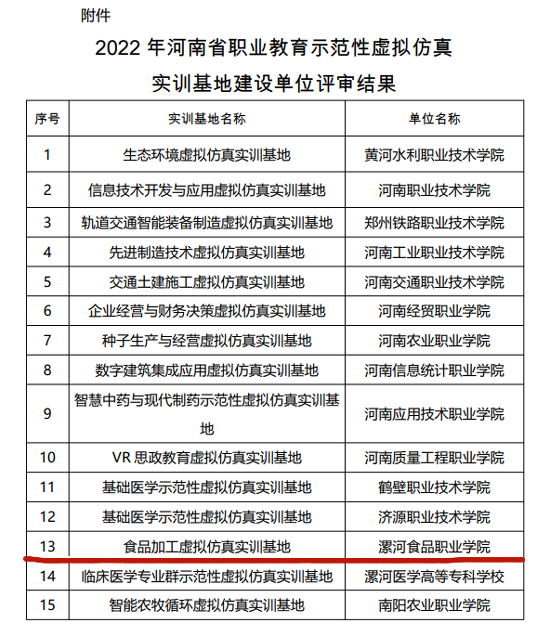 2023/05/25食品加工虚拟仿真实训基地,被认定为“河南省职业教育示范性实训基地”