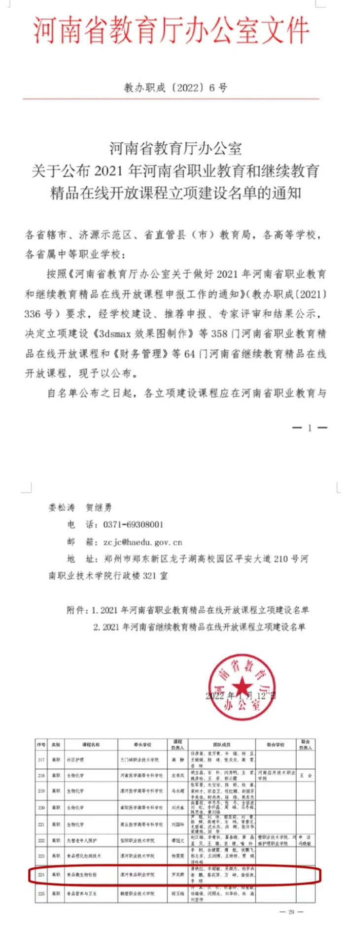 按照《河南省教育厅办公室关于做好2021年河南省职业教育和继续教育精品在线开放课程申报工作的通知》经学院建设、推荐申报、专家评审和结果公示,决定立项建设《3dsmax效果图制作》等358门河南省职业教育精品在线开放课程和《财务管理》等64门河南省继续教育精品在线开放课程,我系食品微生物检验在河南省职业教育与继续教育数字...... 阅读(1760)