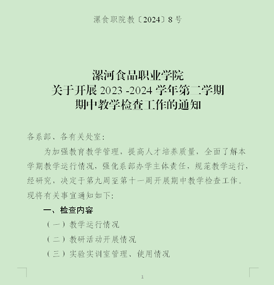 2024/04/24食品检测系关于开展2023-2024学年第二学期期中教学检查工作的实施方案