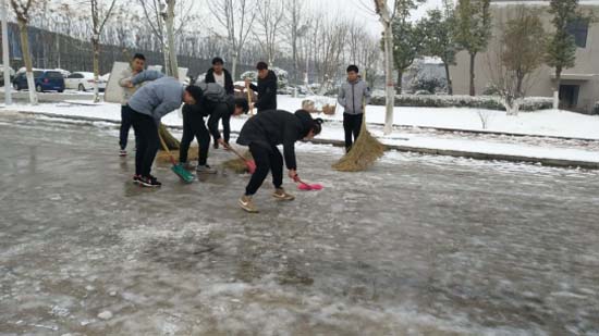 1月10日上午9:00,在食品检测系主任,党支部书记侯保清的带领下,我们食品检测系的学生们开始了清除路面积雪的紧张工作,重点是校园门口周围的主要通道,为早起的学生和老师“开路”,最大限度减少冰雪天气给师生出行带来的安全隐患。
