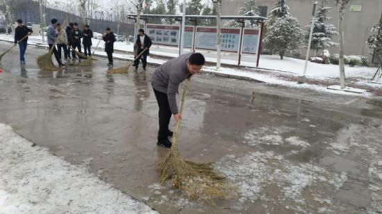 点点扫雪事,铲铲关爱情。我们不仅要让他们看到美丽的雪景,享受大雪带来的快乐,也要让他们能够安安全出行。扫雪活动中,大家挥动铁锹,舞动扫帚,个个精神抖擞、干劲十足,成为校园里一道靓丽的风景线。