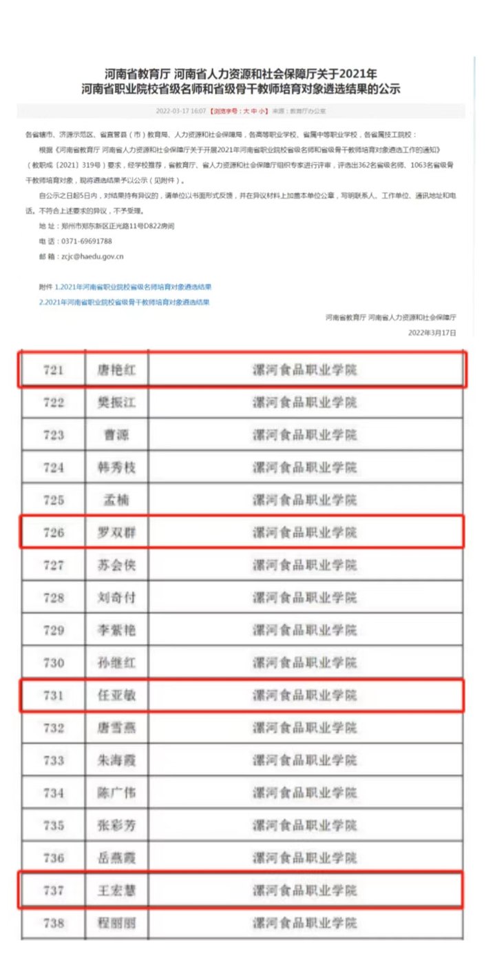 根据《河南省教育厅 河南省人力资源和社会保障厅关于开展2021年河南省职业院校省级名师和省级骨干教师培育对象遴选工作的通知》(教职成〔2021〕319号)要求,经学校推荐,省教育厅、省人力资源和社会保障厅组织专家进行评审,评选出362名省级名师、1063名省级骨干教师培育对象。我系唐艳红、王宏慧、罗双群、任亚敏四名老师...... 阅读(1476)