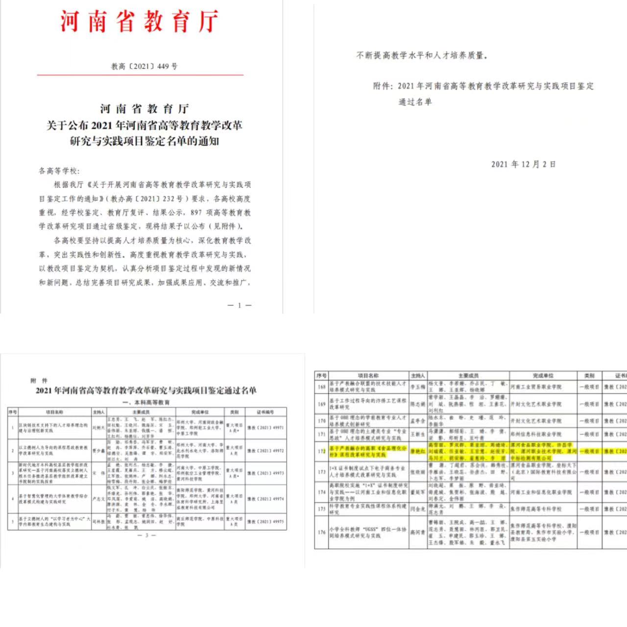 日前,河南省教育厅下发了《关于公布2021年河南省高等教育教学改革研究与实践项目鉴定名单的通知》(教高〔2021〕449号),我系2019年立项的“基于产教融合的高职《食品理化分析》课程改革研究与实践”项目顺利通过省级鉴定。 该项目是2019年由我院食品检测系牵头,联手许昌学院、漯河职业技术学院、漯河中标检测服务有限公...... 阅读(1190)