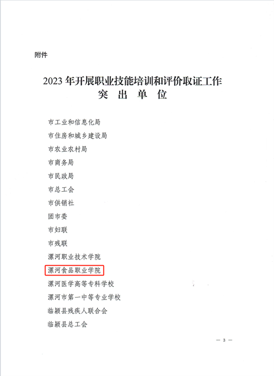 2024/03/10漯河食品职业学院被评为 “职业技能培训和评价取证工作突出单位”