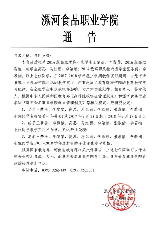 根据国家教育部、河南省教育厅相关文件要求,上述七位同学可以于本通告公布之日起十天内,向漯河食品职业学院学生处、漯河食品职业学院食品质检系提出申诉。