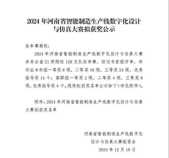 2024/12/18喜讯:我院在2024 年河南省第一届智能制造生产线数字化设计与仿真大赛中创佳绩