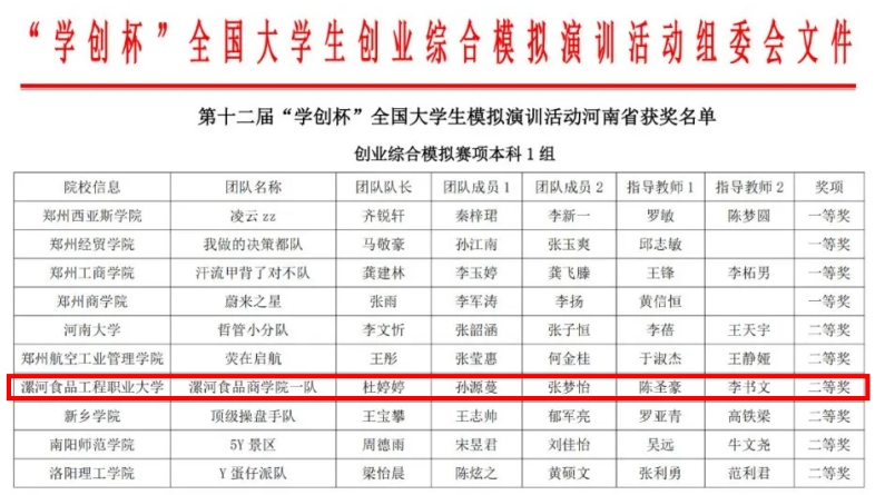 近日,2025年第十二届“学创杯”全国大学生创业综合模拟大赛河南省赛结果揭晓,漯河食品工程职业大学经济管理学院在竞赛中成绩显著,荣获省赛(本科组)一等奖2项,二...