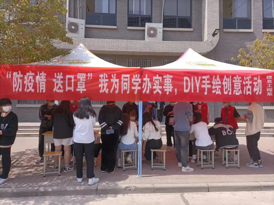为了弘扬抗疫精神,树立良好的卫生意识,丰富学生的校园管控期间生活,消除同学们对疫情的焦虑感,2022年4月7日我院信息工程系团总支在校园超市门口开展为期两天的“防疫情送口罩,我为同学办实事”手绘口罩活动,活动一经发出,各年级的同学们都努力发挥自己的想象与动手能力,积极参与其中,用颜料、画笔、彩绘、涂鸦的方式在口罩上创作......