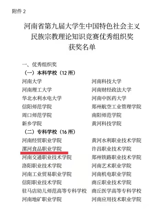 漯河食品职业学院获河南省第九届大学生中国特色社会主义民族宗教理论知识竞赛优秀组织奖