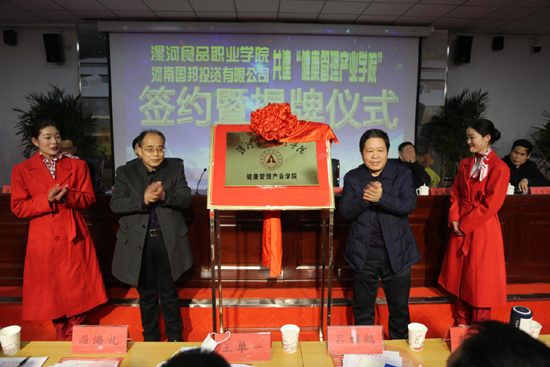 随后,院党委书记詹跃勇及河南国邦投资有限公司执行董事陈超然分别代表学院及企业签署合作共建协议并为“健康管理产业学院”揭牌。
