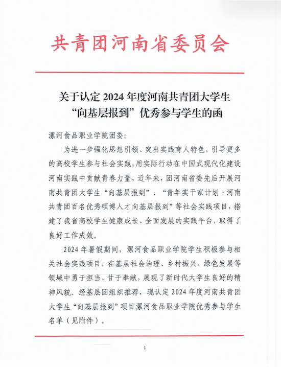 2024/10/11喜报!信息工程学院学子刘佳庆被团省委认定为“向基层报到”优秀参与学生