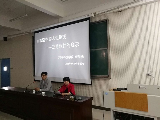 4月10日下午,应学院科技处和信息工程学院的邀请,河南科技学院计算机网络与信息安全教研室主任、“三月软件”课外小组创办人李学勇教授来我院进行交流,并作了题为“IT浪潮中的人生蜕变——“三月软件”的启示”的学术报告。报告会由信息工程系主任王黎主持。