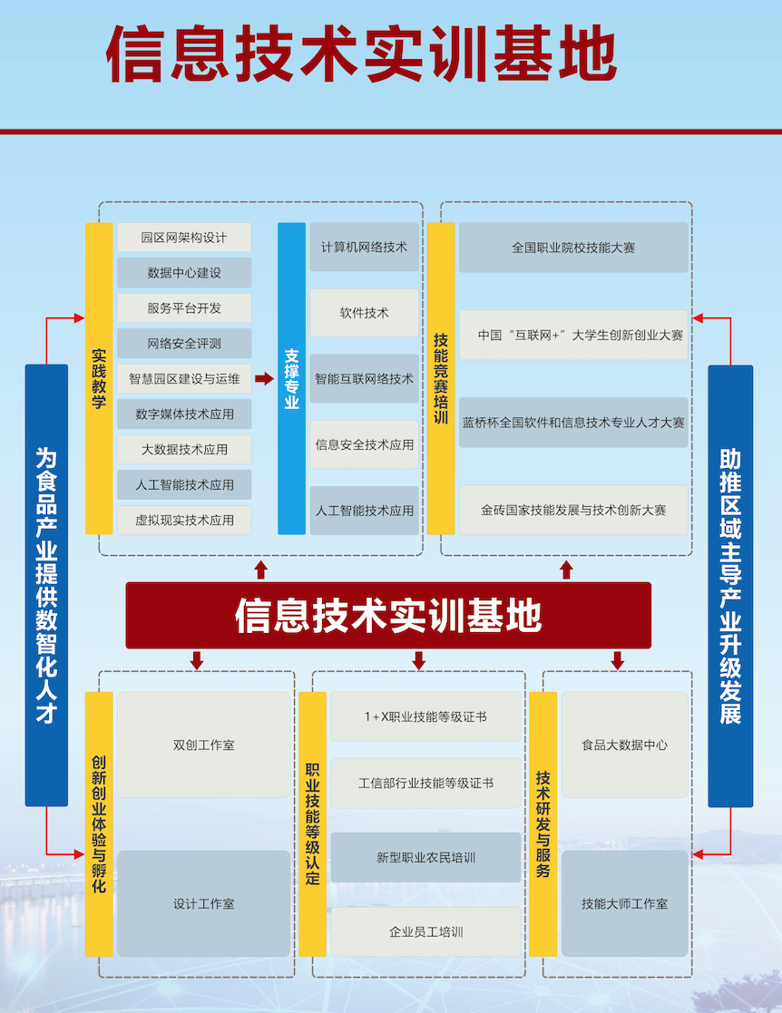 信息技术实训基地是国家级高技能人才培养培训基地,总面积4620平方,各类实训设备2577台套,学生专业实训工位2154个,设备总价值1561万元。 基地积极推进 “产学研转创” 融合发展,与多家企业共同创建了能够满足园区网架构设计、数据中心建设、服务平台开发、网络安全测评、智慧园区建设与运维、数字...... 阅读(1421)