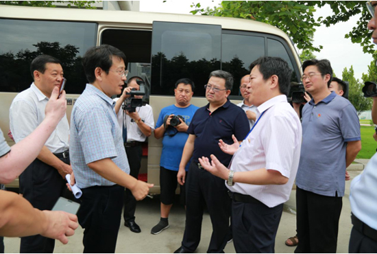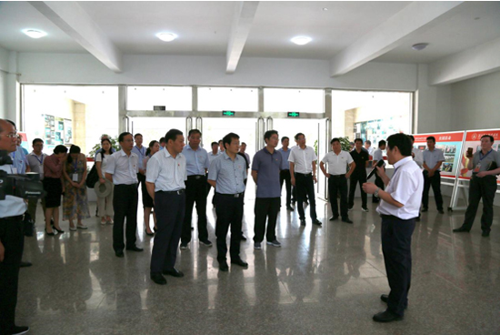 院党委书记詹跃勇(右一)向蒿慧杰(前排中)及观摩团汇报工作