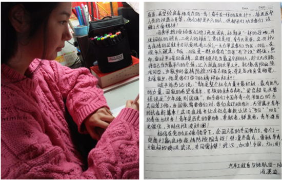 18级汽车工程系冯潇迪同学说:自疫情爆发以来,全国人民众志成城抗击疫情,全国各地的医护人员纷纷支援湖北,用崇高的职业道德精神,专业的知识,以及舍己为人的无私精神,奔赴湖北,抢救治愈病患,在如此短的时间内使疫情得到了有效的控制,这份对生命的崇高敬畏值得每一个人学习。