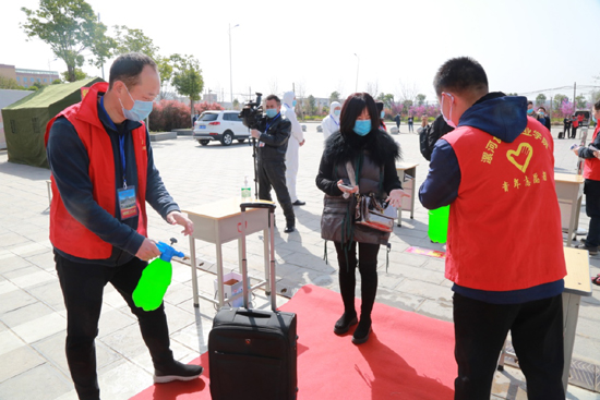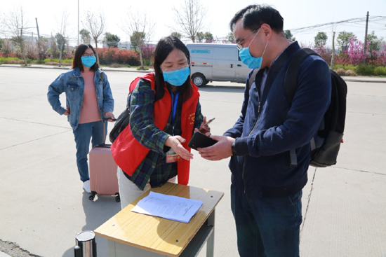 校门口临时隔离室医务人员对入校“发热”学生进行询问登记