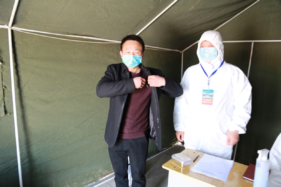 校门口临时隔离室医务人员对入校“发热”学生进行腋下测温