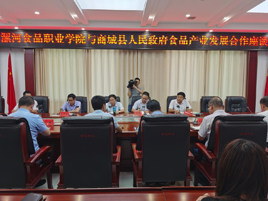 在随后召开的座谈会上,商城县县长周哲热烈欢迎学院考察团一行到商城县考察调研,他表示,商城县区位优势明显,生态环境优美,人文底蕴丰厚,有着优良的农副土特产品优势以及发展绿色食品产业优势。人才战略是推动商城县经济发展的必由之路,希望漯河食品职业学院充分发挥学院职业教育资源优势,进一步加强与商城县交流与合作,构建与当地经济和产业结构相适应的职业人才培养体系,实现共同发展。