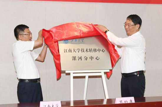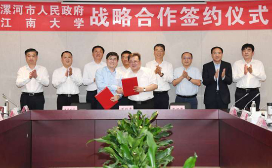 在签约仪式上,市长刘尚进与陈卫院士分别代表市政府和江南大学签订《全面战略合作协议》,并共同为江南大学技术转移中心漯河分中心揭牌;在市领导和与会专家教授的共同见证下,漯河食品职业学院与江南大学食品学院签订了《合作框架协议》、漯河市科技局与江南大学产业技术研究院签订了《江南大学技术转移中心漯河分中心合作协议》、漯河市委人才办与江南大学人力资源处签订了《人才交流合作协议》、漯河市市场监管局与江南大学食品学院签订了《食品安全检验检测技术能力提升合作协议》,孙秀兰教授与漯河市卫龙生物技术有限公司、姚卫蓉教授与河南恒瑞淀粉科技股份有限公司、蒋平平教授与漯河樱花包装材料有限公司、张聪教授与河南双建管桩股份有限公司分别签约。