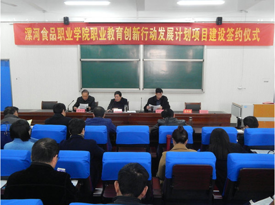 根据会议议程,执行院长赵国运宣读了《河南省高等职业教育创新发展行动计划(2015—2018年)》,并根据《河南省高等职业教育创新发展行动计划(2015—2018年)》项目明确了我院承担的项目内容、项目负责人及责任单位;院长李五聚同各项目单位责任人分别签订了漯河食品职业学院职业教育创新发展行动计划项目建设《目标责任书》。