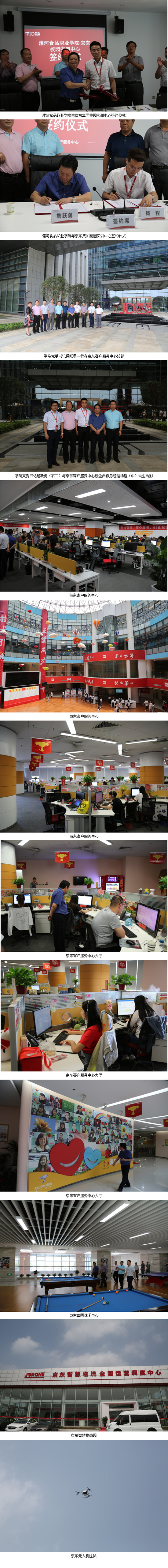 京东集团是中国惟一一家跻身世界500强的互联网公司,是全球电子商务的领军企业。漯河食品职业学院与京东集团的战略合作主要有两方面的内容:一是共建京东订单班,为京东培养专业化的人才;二是共建京东校园实训中心,将京东全真的职场引入到学校,学生在校期间工学结合,知行合一,电商理论学习与实践真正实现了零距离。根据规划,漯河食品职业学院京东校园实训中心首期规模为300平米和60个座席,中心2—3年内规模达到2000平米和250—300座席,成为全国最大的京东校园实训中心和京东校园创新创业实训孵化中心,在京东集团全国校企合作项目中起到示范和引领作用。