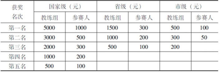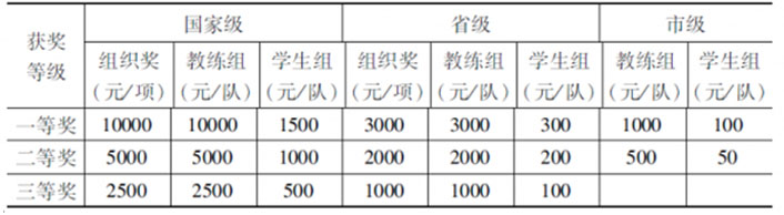 1.团体奖包括一等奖、二等奖、三等奖,同一批次参赛项目获得多项团体奖时,其奖金以取得的最高团体奖项标准给予奖励。奖励标准(见表1)