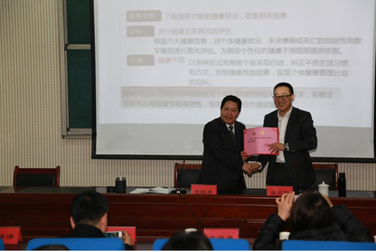 党委书记詹跃勇对梁玉军先生的报告做了梳理,从哲学的高度指出“健康管理属于上层建筑方面的范畴”,是“健康中国与健康国人的大势所需”。同时表达了对我院师生健康生活的高度重视,对我院开展健康管理教育寄予了殷切的希望。最后,詹跃勇书记代表院党委、行政及全院师生聘请梁玉军研究员为我院的客座教授并现场颁发了聘书。