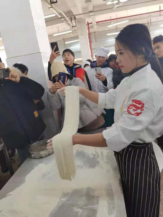 比赛间隙,酒店烹饪产业学院院长刘强为同学们表演了名菜《拔丝苹果》,中国烹饪大师张付罗表演了名菜《布袋献宝》,酒店烹饪产业学院面点教师孙春雪、赵静方老师为同学们展示了拉面龙须面的制作。